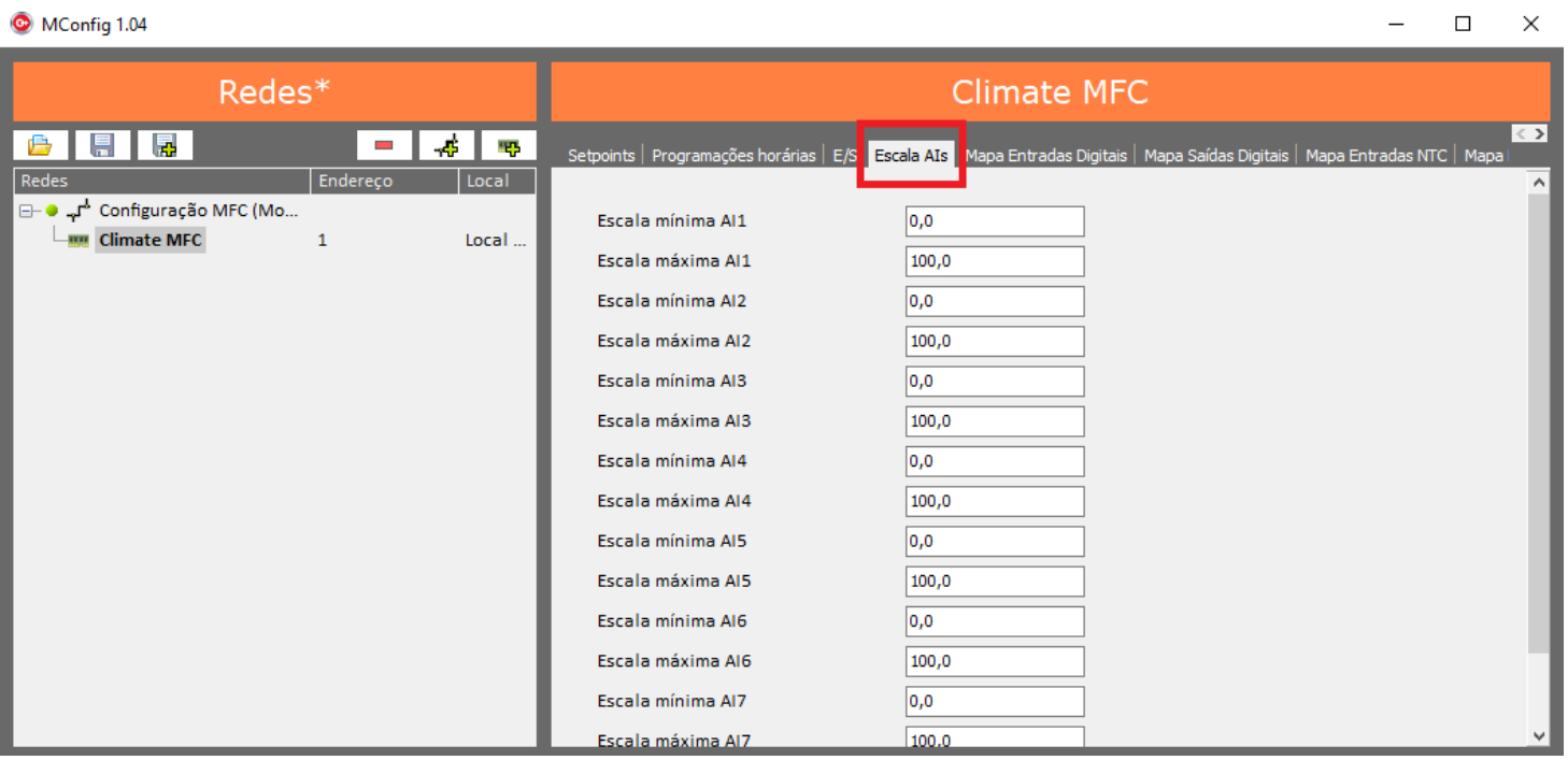 9. Definição do valor de temperatura: Na aba "Escala AIs", defina os limites de temperatura do sensor, correspondentes aos valores mínimo e máximo da entrada analógica.