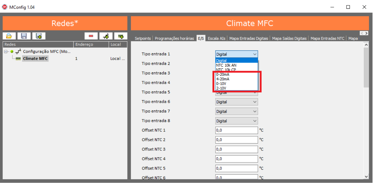 8. Seleccionar el tipo de entrada: En el menú "E/S",selecciona el tipo de señal en la entrada del sensor conectado. Por ejemplo, si estás utilizando la entrada 1 del MFC, cambia el tipo de la entrada 1.