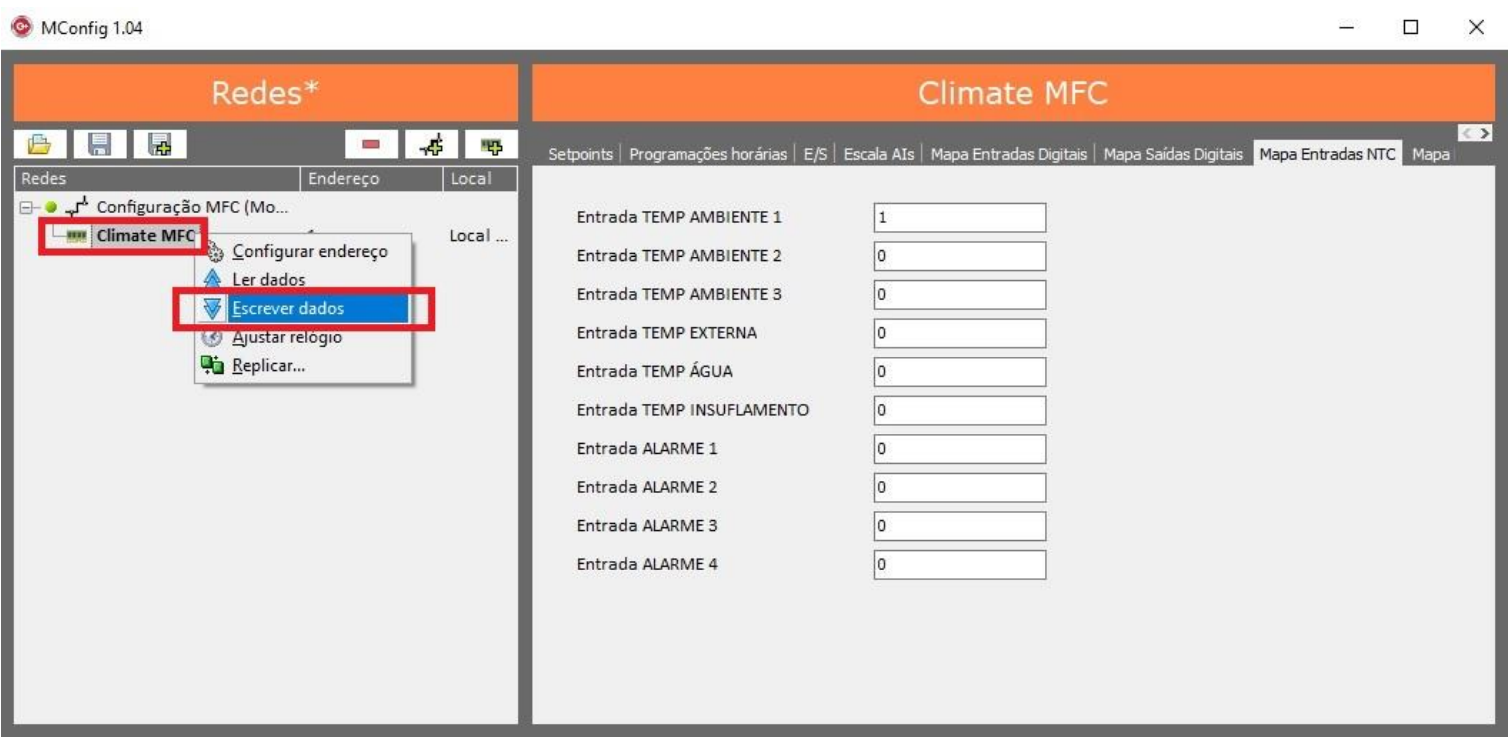 11. Escribir datos: Después de finalizar las configuraciones, haz clic con el botón derecho del mouse sobre “Climate MFC” y selecciona "Escrever dados" para guardar las configuraciones en el controlador.