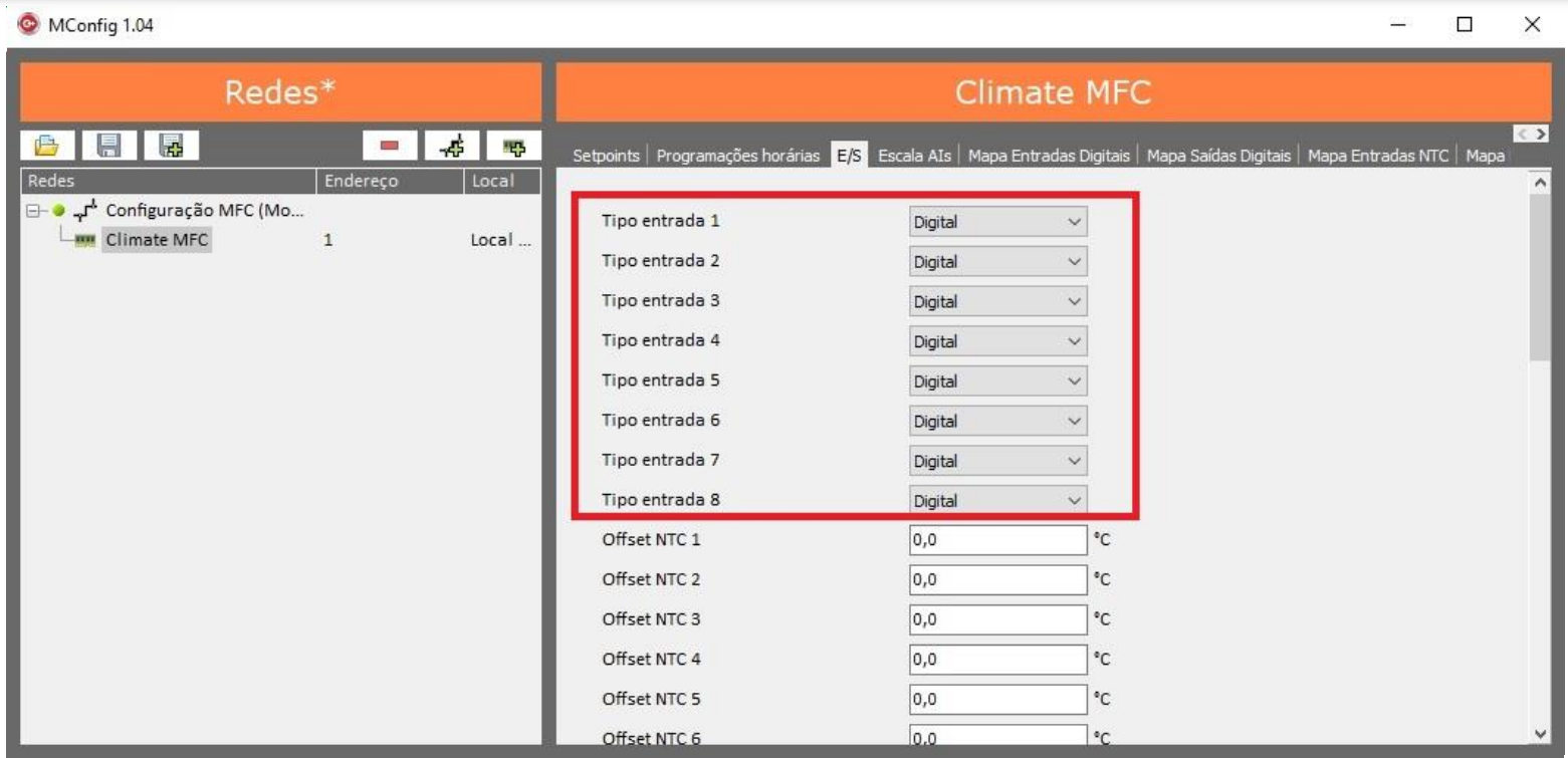 8. Seleccionar el tipo de entrada: En el menú "E/S", selecciona el tipo de entrada del sensor conectado. Por ejemplo, si estás utilizando la entrada 1 del MFC, cambia el tipo de la entrada 1.