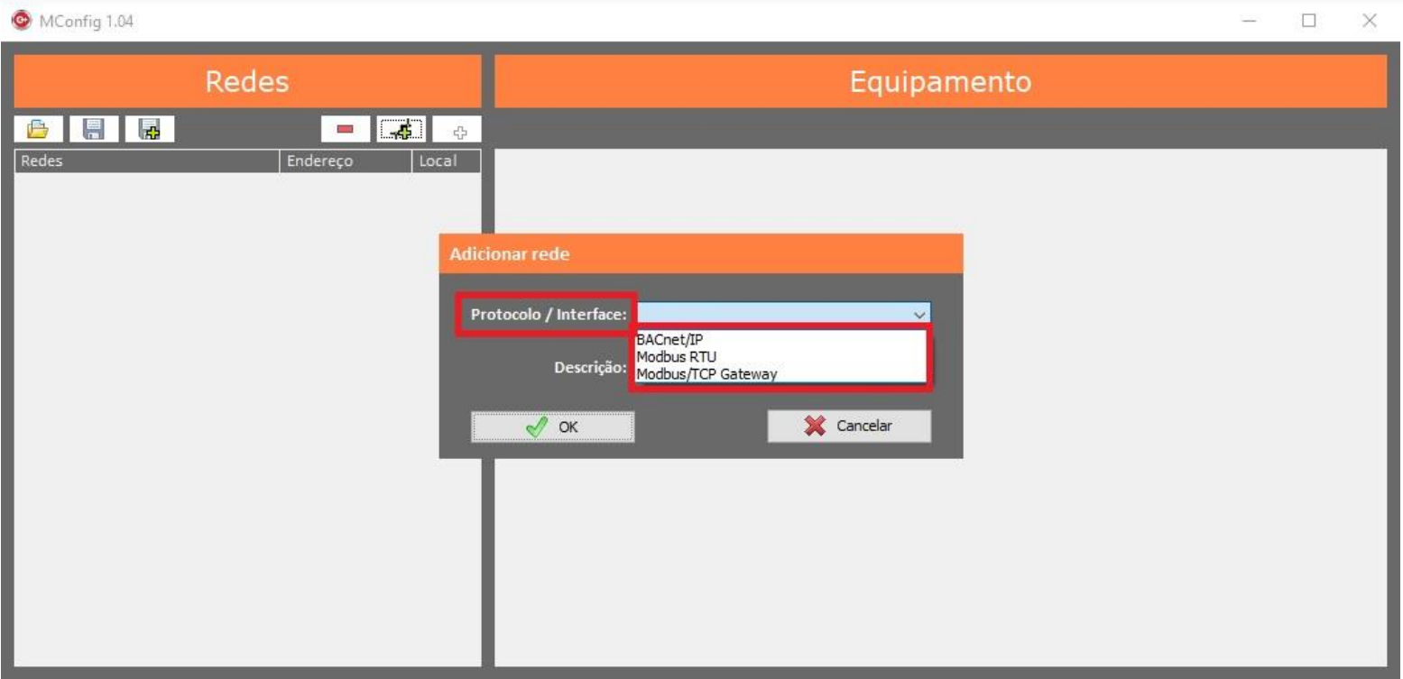 2. Seleccionar la interfaz: Elige el protocolo/interfaz que se utilizará. Completa el campo "Descrição" con el nombre de la red que deseas configurar.