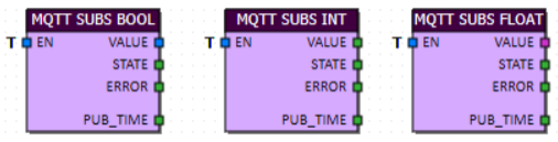 Cuando está conectado al broker, la entrada EN controla el estado de la suscripción. Al activarse, el bloque se suscribe al tópico. Al desactivarse, el bloque cancela la suscripción. La salida VALUE contiene el último valor recibido. La validez de este valor depende de la salida STATE, que indica el estado de la suscripción. Si STATE es 3, el bloque está suscrito al tópico, pero aún no se ha recibido ninguna publicación (valor). Cuando STATE es 4, la salida VALUE es válida.