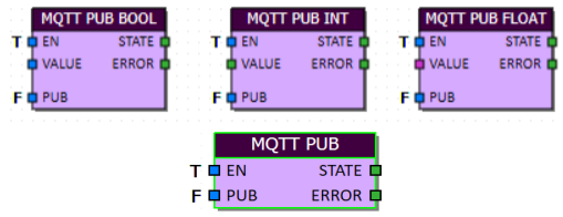 Para cada formato de dato soportado por el lenguaje gráfico, existe un bloque PUB correspondiente (BOOL, INT y FLOAT). Estos bloques envían al broker el valor de la entrada en formato texto. Para un mejor control del formato del mensaje, se debe utilizar el bloque MQTT_PUB, que permite seleccionar libremente el formato del mensaje (payload). Consulte el manual del módulo TAGS para más detalles.