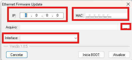 3. Preencha os campos IP e MAC, selecione o arquivo de firmware (.boot) clicando no botão de três pontos (…) e escolha a interface do seu computador.