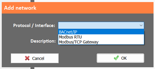 2. On the popup, select the network type and give it a description. This doesn't need to be the network from the building. It can be a local network that is dedicated to just configure the controllers.