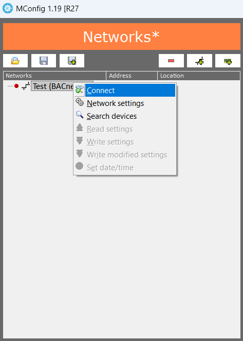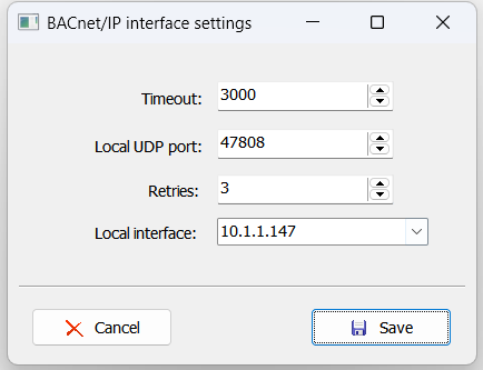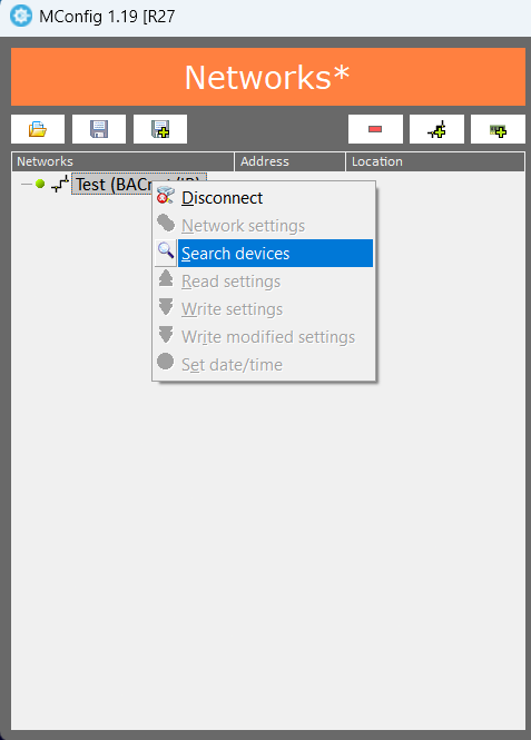 3. Right click the network and click on "Network settings" and configure it according to the controller's communication settings. Make sure to select the appropriate port and local interface on the popup and hit the floppy disk button to save. Do not manually input the interface.