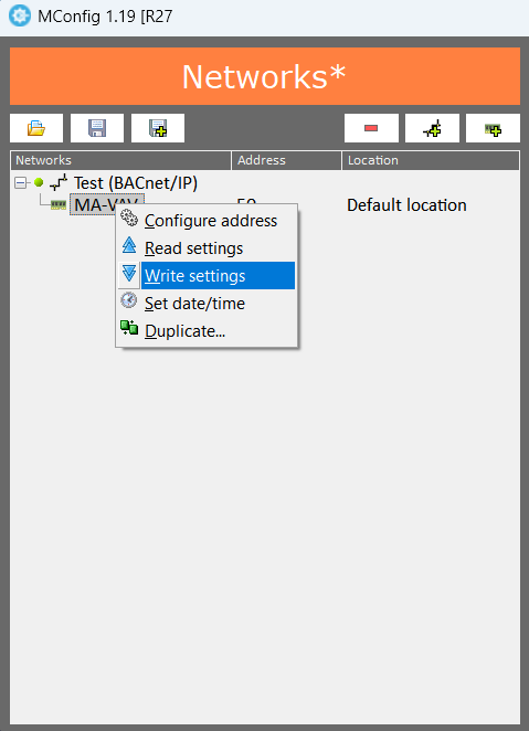 6. Once the controller is added to the software, you can configure it accordingly. Changing the settings on the MConfig software is the same as changing the settings on the web-server and vice-versa. Once configured, right click the controller under the network and hit "Write settings". Please Wait for the software to download it to the controller and you're all set.