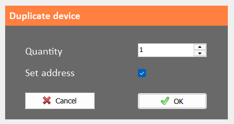 Under "Quantity" select how many duplicates you want and hit the checkbox "Set address" to duplicate it to an already existing DEVICE ID (BACnet/IP) or the slave's network address (Modbus).